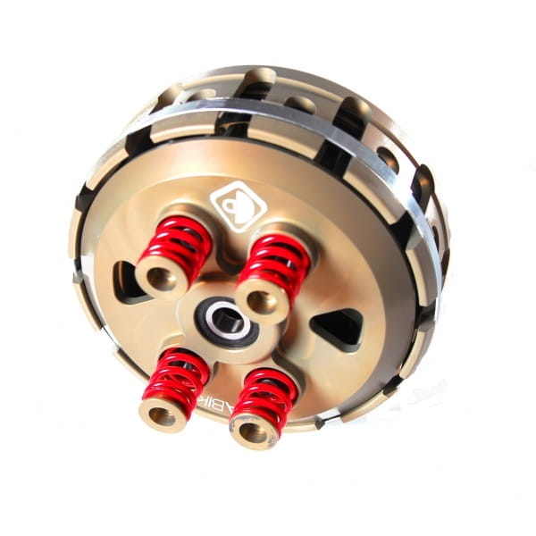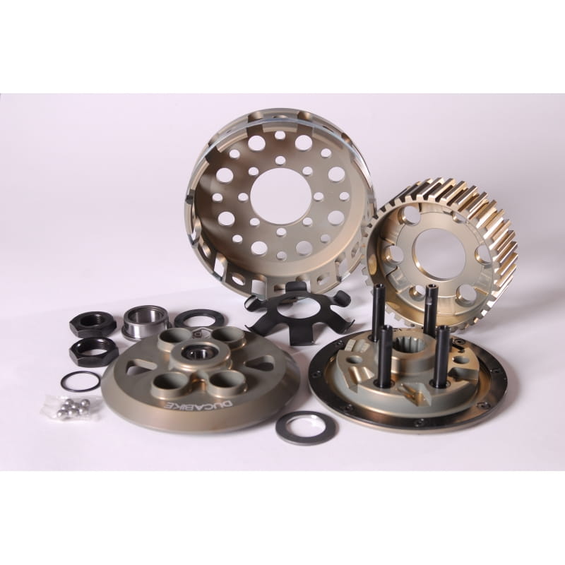 Sprzęgło zapobiega blokowaniu i przesuwaniu się tylnego koła podczas szybkich zmian biegów w dół. Zwłaszcza w wejściu na zakręt! Z kolei sprzęgło antyhoppingowe zapewnia optymalne bezpieczeństwo. Aby pokazać świetny wygląd optyczny i poprawić chłodzenie, sprzęgło to powinno być używane w połączeniu z otwartą osłoną sprzęgła. Sprzęgło zostanie dostarczone wraz z instrukcją montażu. Wszystkie części sprzęgła są produkowane przez DUCABIKE z oczekiwaną jakością "made in Italy". Sprzęgło działa za pomocą kulek, które poruszają się po pochyłej płaszczyźnie w zoptymalizowanym okrągłym torze. Jest to jedyna możliwość zapewnienia płynnego i wolnego od szarpnięć działania sprzęgła nawet w najtrudniejszych warunkach. Nowa wentylacja za pośrednictwem płyty dociskowej zapobiega przegrzewaniu się sprężyny centralnej i zapewnia stałą niezawodną pracę nawet w najcięższych warunkach pracy. Używamy wyłącznie certyfikowanych materiałów o najwyższej jakości. Do zestawu dołączona jest lista części, wszystkie części sprzęgła można zamówić ponownie.